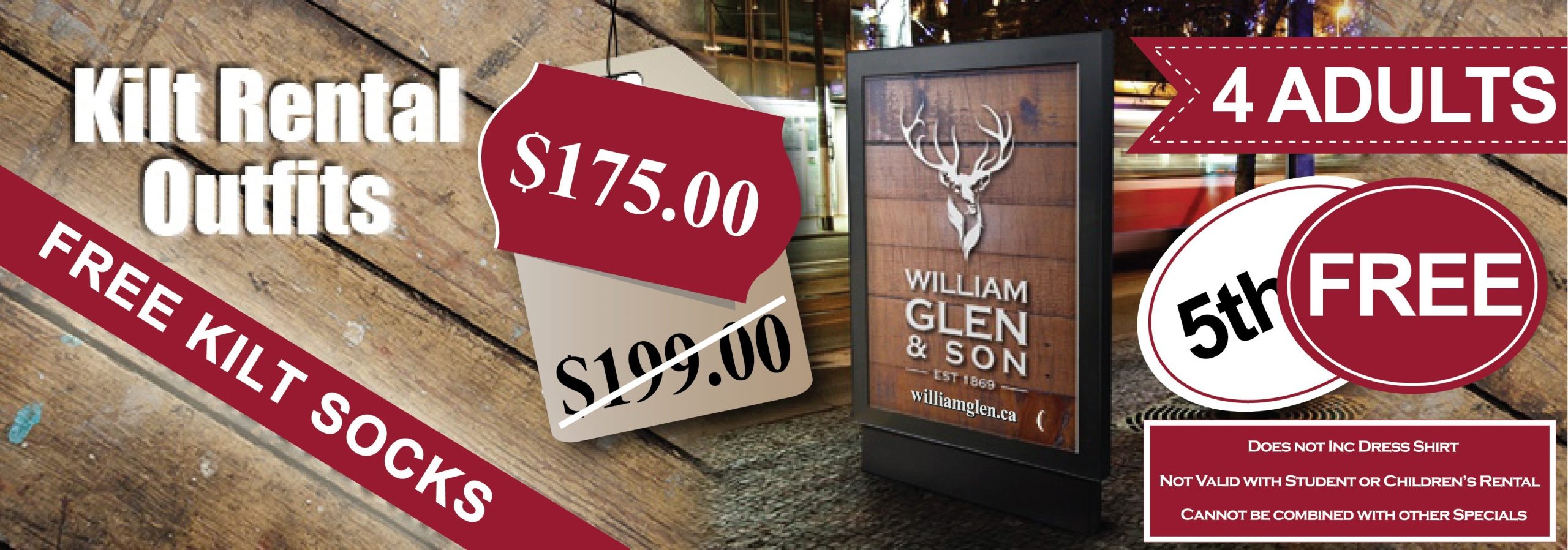 A very warm welcome to William Glen & Son, we have been established in Canada for over 28 years now, Canada's Premier Scottish Store, customers from across this Great Country appreciate why we are so Highly Regarded. We are Proudly Scottish Owned & Operated and Our Custom Kiltsetc. are still Made in Scotland. Retailer and Rental supplier of Highland Dress & Goods, we ship Canada/USA. Duties may be added to USA Orders